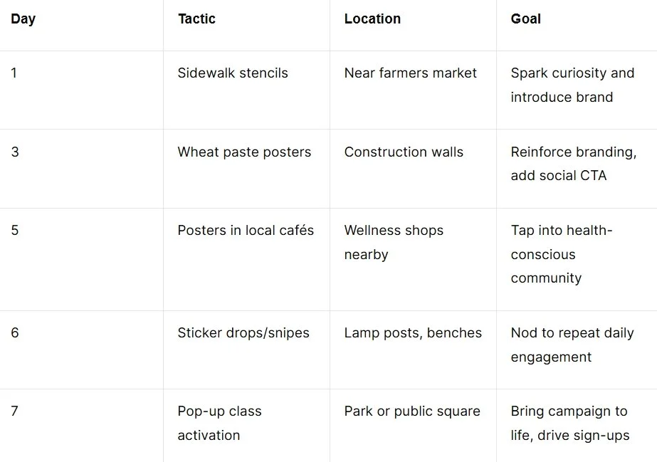 This guerrilla marketing schedule highlights how Sidewalk Tattoos promotes pilates studios with a weeklong campaign. Starting with sidewalk stencils near farmers markets, followed by wheat paste posters on construction walls, café posters in wellness shops, and sticker drops on lamp posts, the campaign ends with a pop-up class activation in a public square. Each tactic builds anticipation, reinforces branding, and drives sign-ups with authentic street-level impact.