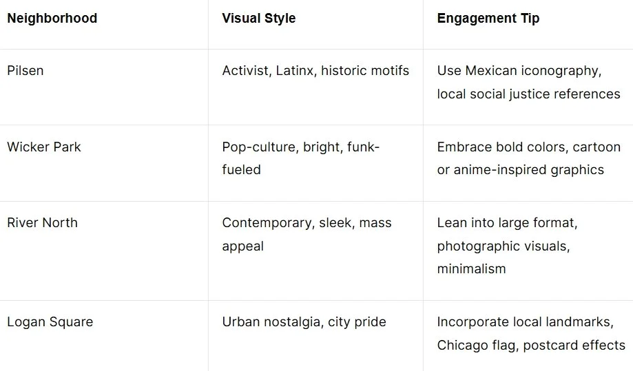 No two neighborhoods in Chicago are the same, and campaigns that thrive are those that perfectly match message to audience. Wicker Park’s young, creative residents respond to playful, visually rich content. River North attracts both affluence and downtown energy—here, sleek design or bold minimalism work well. The Loop, always buzzing, offers sheer scale: even a brief sidewalk activation at Clark/Lake Station could net tens of thousands of impressions.