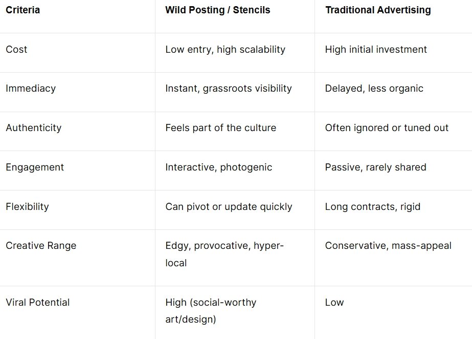 Wheat paste campaigns contrast vividly with typical outdoor or digital ads. Here’s a breakdown: