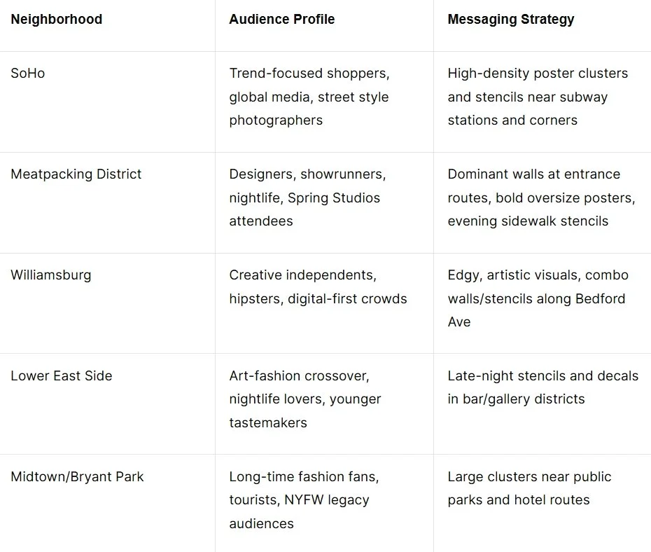 This chart highlights neighborhood-specific guerrilla marketing strategies for New York Fashion Week. In SoHo, trend-focused shoppers and global media encounter dense poster clusters and sidewalk stencils. The Meatpacking District attracts designers and nightlife with oversized posters and evening stencils. Williamsburg engages creatives with artistic visuals and combo walls along Bedford Ave. The Lower East Side leverages nightlife crowds with late-night stencils and decals, while Midtown and Bryant Park target fashion fans and tourists with large poster clusters near hotels and public parks.