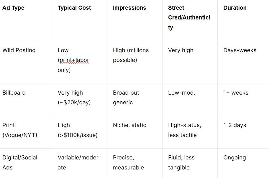 This chart compares different advertising types for impact and efficiency. Wild posting offers low cost with high impressions, strong street credibility, and campaigns lasting days to weeks. Billboards are very high cost (around $20k/day) with broad but generic reach. Print ads in outlets like Vogue or The New York Times are expensive (over $100k/issue), niche, and short-lived. Digital and social ads provide measurable results with ongoing reach but lack the authenticity and cultural relevance of wild posting.