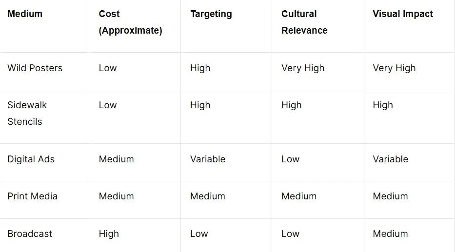 This table highlights the strengths of guerrilla tactics like wild posters and sidewalk stencils compared to traditional media. Wild posters and sidewalk stencils stand out as low-cost, high-targeting strategies with strong cultural relevance and very high visual impact, while digital ads, print, and broadcast tend to have higher costs, weaker targeting, and less cultural integration.