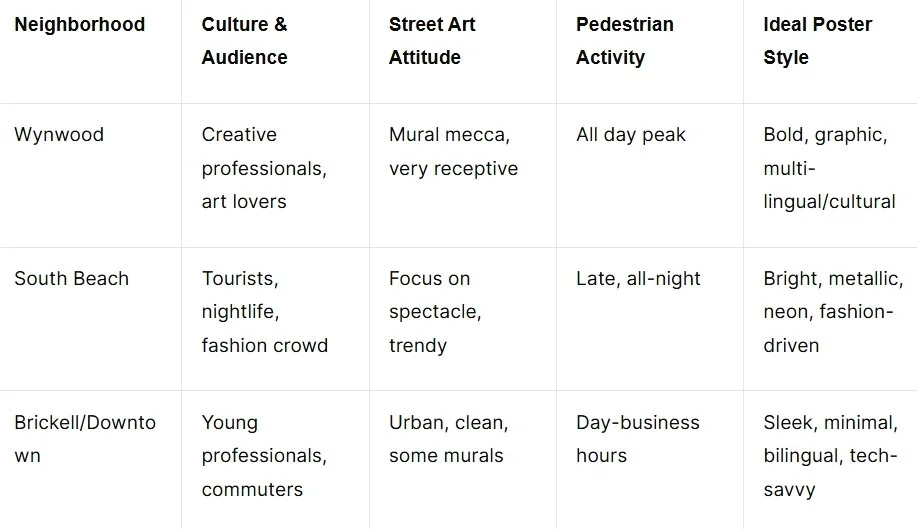 This chart breaks down guerrilla marketing strategy for Miami product launches using wheat paste posters. Wynwood thrives on bold, cultural designs for art lovers, South Beach favors bright and trendy visuals for the nightlife crowd, and Brickell/Downtown benefits from sleek, minimal styles targeting young professionals and commuters.