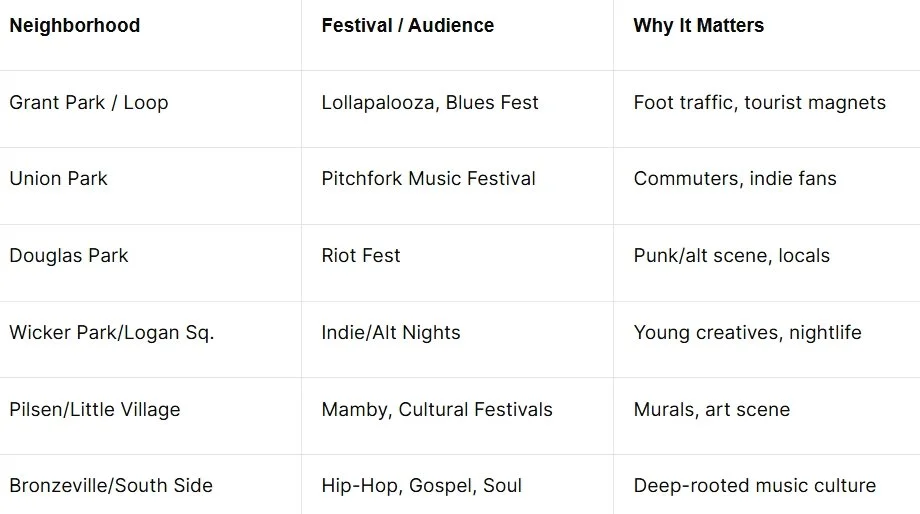 Chicago is a city of neighborhoods, each with its own vibe and musical leanings. Smart wild posting campaigns know exactly where to hit. Here’s a quick overview of festival-adjacent neighborhoods that deliver maximum festival visibility: