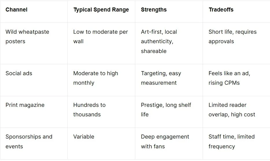 This table outlines a quick cost and strategy comparison for breweries and local brands. It highlights how wild wheatpaste posters offer low to moderate costs per wall with authentic, art-driven appeal, while social ads require higher monthly budgets but provide precise targeting. Print magazines offer prestige and longevity at higher costs, and sponsorships or events deliver deep engagement with fans but demand staff time and planning. The chart underscores why street-level tactics like wild wheatpaste poster advertising for breweries in Portland often outperform traditional channels for local reach and shareability.