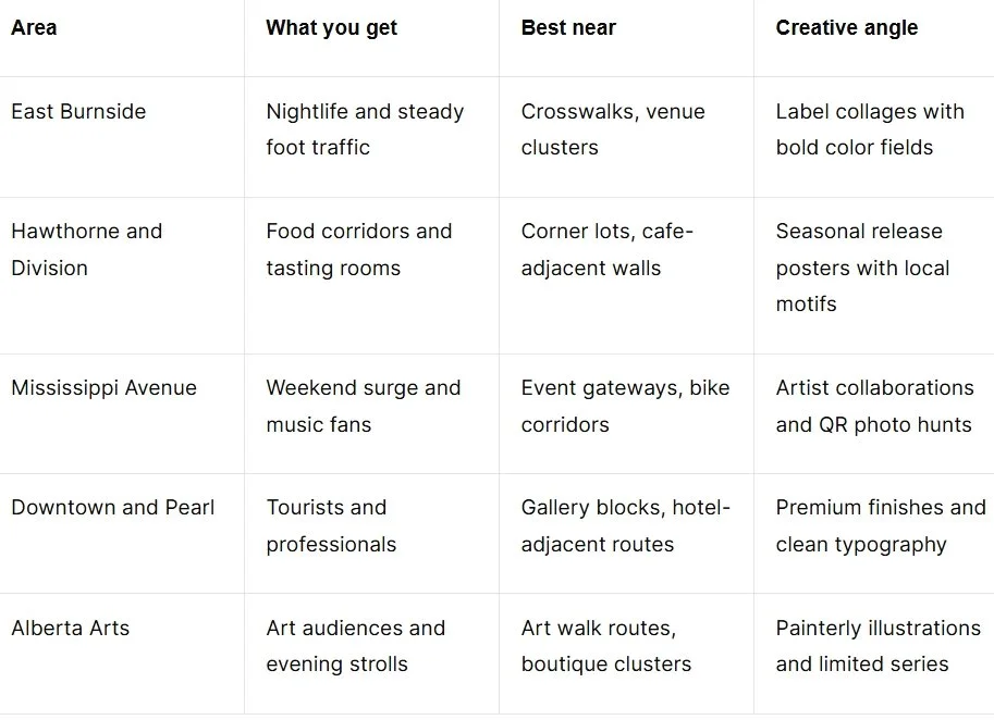 This table highlights five top areas in Portland ideal for wild wheatpaste poster advertising for breweries in Portland. East Burnside offers nightlife and steady foot traffic suited for bold label collages, while Hawthorne and Division attract tasting room visitors and work well for seasonal release posters. Mississippi Avenue connects with weekend music crowds through artist collaborations and QR photo hunts. Downtown and Pearl combine tourism and professionalism with premium design opportunities, and Alberta Arts appeals to creative audiences through painterly, limited-series posters. Together, these corridors create a neighborhood roadmap for effective, art-forward street campaigns.